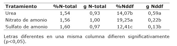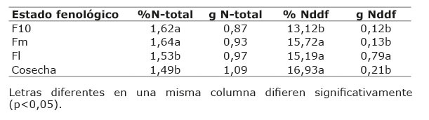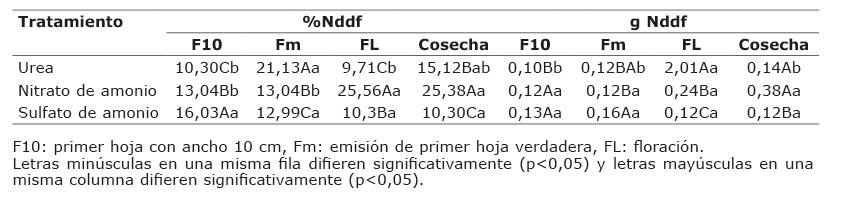 También, se movilizó y acumuló más nitrógeno procedente del Nddf en los estados Fm (15,72%); Fl (15,19%) y cosecha (16,93%) (p≤0,05) con respecto al F10 (13,12%) (Cuadro 4). Los datos obtenidos son congruentes a lo informado por Prasertsak et al. (2001), para el porcentaje de recuperación.