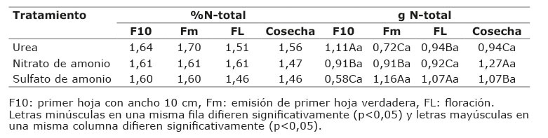 No obstante, para igual estado fenológico con diferentes tratamientos, se presentó diferencias significativas para el estado fenológico F10, donde la Urea (1,11 g) superó al NA y SA. Para el estado Fm, el tratamiento de SA (1,16 g) obtuvo un mayor valor con respecto a los demás tratamientos. En el caso del estado Fl, el tratamiento de SA (1,07 g) y al momento de la cosecha, con el tratamiento de NA (1,27 g) se encontraron diferencias significativas con respecto a los demás tratamientos en cada etapa fisiológica. Tal comportamiento, podría indicar la necesidad de implementar un programa de fertilización que intercale las diferentes fuentes empleadas en este trabajo, para obtener la concentración mayor de N en los tejidos de la planta, para optimizar la productividad de la plantación.