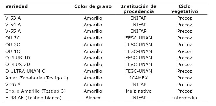 En cada ensayo se evaluaron trece variedades procedentes del INIFAP y la FESC-UNAM, como se muestra en el Cuadro 1. Entre las variedades de grano amarillo, cuatro de ellas proceden del INIFAP, seis de la FESC-UNAM, una variedad testigo procede del ICAMEX, otra corresponde a un maíz nativo y se utilizó el testigo comercial de grano blanco, de mayor uso en los Valles Altos (González et al. 2008). En los dos experimentos la densidad de población fue de 45 000 plantas/ha, recomendada para este tipo de siembras, la parcela experimental constó de un surco de 5 m de largo por 80 cm de ancho, lo que dio un total de 4 m2 como parcela útil. Se utilizó el diseño experimental de bloques completos al azar, con tres repeticiones. Los experimentos se manejaron bajo condiciones de secano, humedad que procede de la precipitación, en ambos casos las siembras fueron en el mes de junio de 2010, lo que se considera una fecha de siembra retrasada.