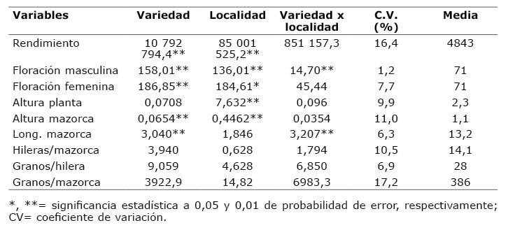 En el análisis de varianza combinado de los dos experimentos, CEVAMEX y FESC, para rendimiento se detectó diferencias altamente significativas para variedades y localidades, no así para la interacción variedades x localidades, lo cual señala que existe una respuesta similar de las variedades en las dos localidades de evaluación, lo que es explicable ya que los dos ambientes se condujeron bajo condiciones de temporal y aún cuando están distantes, ambas localidades se ubican en una altitud similar, diferente a lo que se reporta en otros trabajos (Espinosa et al. 2009, Espinosa et al. 2010, Espinosa et al. 2011, Espinosa et al. 2012). La media del rendimiento de los dos ambientes fue de 4843 kg/ha y el coeficiente de variación de 16,4%. Para el factor de variación localidades, se detectaron diferencias altamente significativas para floración masculina, altura de planta y de mazorca; en cambio para la variable floración femenina hubo diferencia significativa y las variables longitud de mazorca, hileras por mazorca, granos por hilera y por mazorca, no se detectaron diferencias estadísticas significativas (Cuadro 2). En variedades se detectaron diferencias altamente significativas (p≤0,01); para las variables floración masculina y femenina, altura y longitud de mazorca; en cambio en el resto de las variables no se presentaron diferencias significativas (Cuadro 2).