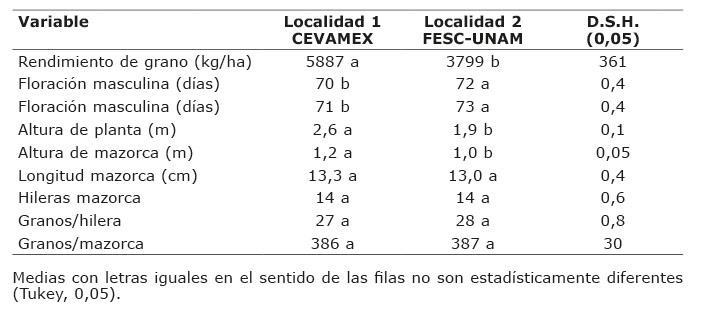 En las variables altura de planta y de mazorca, los valores fueron superiores y diferentes significativamente en la localidad CEVAMEX, con respecto a la localidad de la FESC-UNAM (Cuadro 3), lo cual confirma el mayor potencial que tiene el ambiente de CEVAMEX. En la longitud de mazorca, hileras por mazorca, granos por hilera y por mazorca, se obtuvieron valores promedio estadísticamente similares en ambas localidades (Cuadro 3).