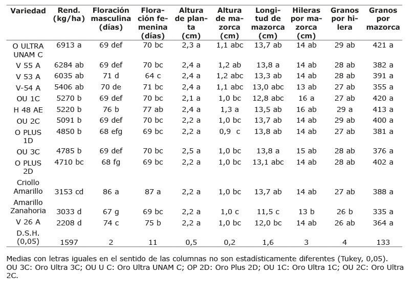 La variedad comercial Amarillo Zanahoria que fue liberada comercialmente por el ICAMEX, en 1990 (Espinosa et al. 2010), fue superada; esto es importante ya que la cantidad de semilla disponible es limitada; por otra parte, es importante mencionar que hay disponibilidad de semilla comercial de las variedades que la superaron, lo cual facilita su uso extensivo en los siguientes ciclos. En las variables altura de planta y granos por mazorca, no se detectaron diferencias significativas, en el resto de las otras variables si hubo significancia (Cuadro 3).