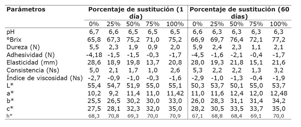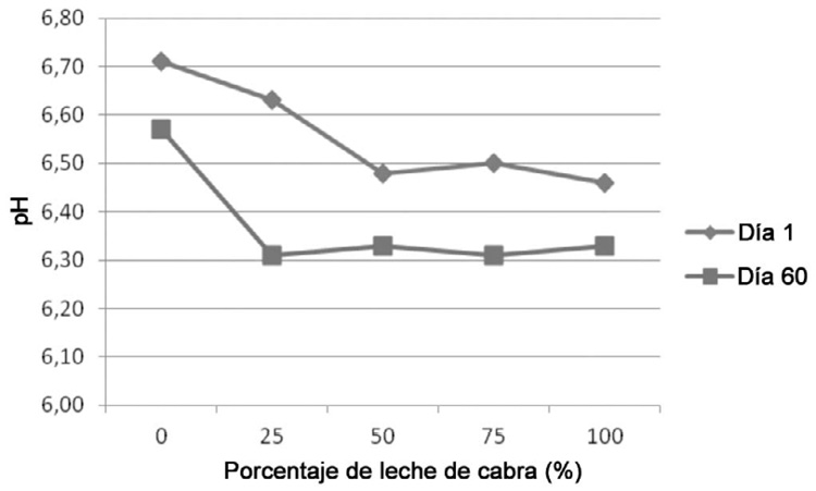 Al observar el comportamiento del pH del dulce de leche (Figura 1), es posible afirmar que, en general, ya sea al día 1 o al día 60 de almacenamiento, este disminuyó al aumentar el porcentaje de leche de cabra en la formulación. Con base en los resultados del análisis inicial de la acidez de la leche, no es posible atribuir un efecto de la misma en este comportamiento, al ser los contenidos de ácido láctico muy similares en la leche anteriormente al inicio de la manufactura. Además, el pH de las diferentes formulaciones disminuyó con el tiempo. La existencia de una interacción día x producto se refleja en que, durante el almacenamiento, el pH disminuyó menos en la formulación que no tenía leche de cabra y esta disminución fue mayor en el dulce de leche con una sustitución del 25% de leche de cabra.