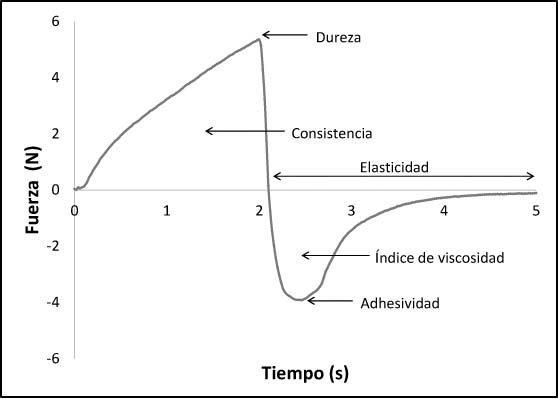 El análisis textural de las distintas formulaciones de dulce de leche se realizó por medio de una prueba de compresión en el propio envase de los productos. Del gráfico de compresión obtenido (Figura 2), se calcularon cinco parámetros: dureza (pico máximo), adhesividad (pico mínimo), consistencia (área de la curva positiva), índice de viscosidad (área de la curva negativa) y elasticidad (tiempo que tarda la muestra en despegarse de la celda de compresión).