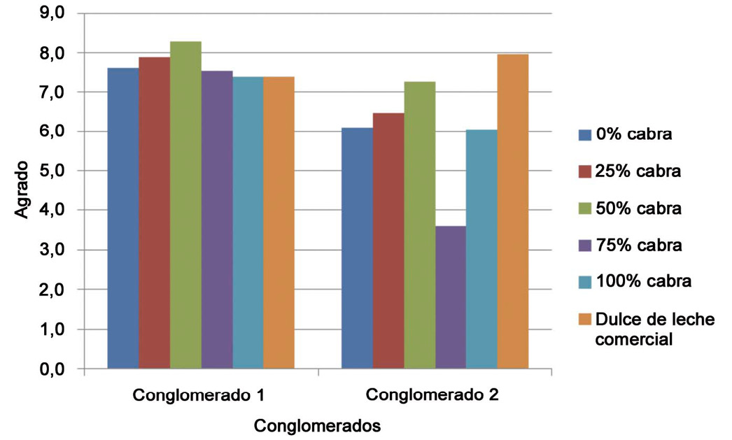 En términos generales, se observó que, para la mayoría de las muestras, se tiene un agrado bastante aceptable (valores mayores a 6); únicamente el dulce de leche elaborado con 75% de leche de cabra obtuvo una calificación entre 3 y 4 por parte del conglomerado 2 (Figura 3). Este rechazo aparente se podría explicar por sus propiedades de viscosidad baja antes descritas, y convierte a esta formulación en la de menores posibilidades técnicas para un eventual desarrollo.