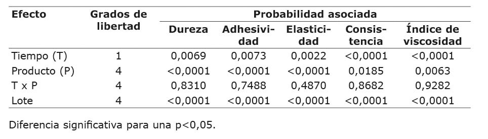 Para todas las variables de textura determinadas en las cinco formulaciones de dulce de leche en los dos tiempos de almacenaje, se realizó un análisis de varianza (Cuadro 9), donde se hallaron, en todos los casos, diferencias significativas en cuanto al tiempo de almacenaje, el tipo de formulación y el lote.