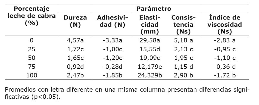 En cuanto a los parámetros de dureza, adhesividad, consistencia e índice de viscosidad del producto, las formulaciones de 25% y 50% de leche de cabra no presentaron diferencias significativas entre sí, siendo todas las demás formulaciones diferentes entre sí (Cuadro 10). La elasticidad presenta valores más variables, registrándose diferencias significativas para todas las formulaciones con distintas proporciones de leche de cabra (Cuadro 10).