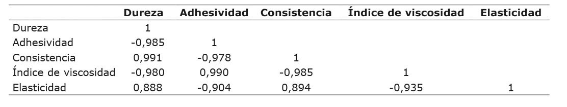 Dado que, según el Cuadro 10, todas las variables de textura evaluadas en el dulce de leche aparentan estar relacionadas entre sí, se evaluaron los coeficientes de correlación entre ellas (Cuadro 11), presentándose excelentes coeficientes de correlación en todos los casos, excepto para las relaciones de la elasticidad con la dureza y con la consistencia, que presentaron valores inferiores a 0,9, pero que, aun así, se puede considerar que tienen una aceptable correlación. De manera que, una sola de estas variables de textura, por ejemplo, la dureza, podría considerarse un buen predictor de todas las demás y utilizarse como parámetro de control de calidad; siendo, entonces, que en el dulce de leche, preparado bajo las condiciones explicadas en este estudio, al aumentar la dureza, aumentan al mismo tiempo la adhesividad, la consistencia, el índice de viscosidad y también la elasticidad. Por otra parte, Valencia y Millán (2009) establecieron, a través de un análisis multivariado, que las variables de textura que mejor representan este tipo de productos son la dureza, la adhesividad y la elasticidad.
