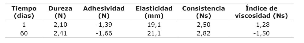Luego de 60 días de almacenamiento, las diferentes formulaciones de dulce de leche se tornaron más duras, adhesivas, elásticas, consistentes y con mayor índice de viscosidad (Cuadro 12). Esto se presenta porque, como se explicó anteriormente, con el tiempo continúa la pérdida de agua del producto por evaporación, lo que conlleva a un aumento en la concentración de sólidos y, por ende, en la viscosidad (Roca 2011), que, como también se señaló, está íntimamente ligada a las demás variables texturales del dulce de leche. Así como el aumento de los grados Brix de los dulces de leche durante el almacenamiento resultó mínimo, de igual manera, su efecto en las variables de textura, también fue reducido, y, al no presentarse cristalización, se comprueba la alta estabilidad física de los productos obtenidos.