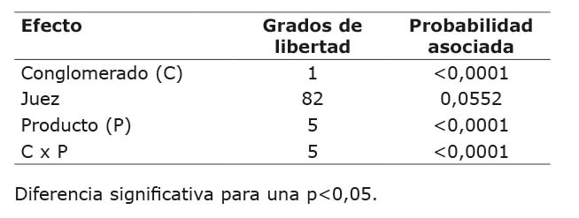 Se destaca que existen diferencias significativas entre conglomerados, y entre los productos y además se presentó una interacción conglomerado x producto (Cuadro 13). Esto quiere decir que el agrado por las muestras es diferente estadísticamente, tanto entre los conglomerados como entre las distintas formulaciones de dulce de leche evaluadas y, además, como existe interacción, cada conglomerado tiene un comportamiento diferente con respecto a la valoración del agrado de las distintas formulaciones. Los jueces no resultaron significativos, lo que indica que sus preferencias, dentro de los conglomerados, son similares.