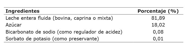 Para la elaboración del dulce de leche se utilizó la formulación base citada por Henderson y Cortés (2001), la que fue modificada a través de pruebas preliminares para prescindir del uso de leche descremada en polvo y de glucosa de maíz (Cuadro 1). La primera modificación se justifica en la inexistencia en el mercado costarricense de sólidos lácteos caprinos. Por su parte, la glucosa de maíz no se incluyó en la formulación para ahorrarle costos al productor, pues las pruebas preliminares no presentaron problemas de cristalización en ausencia de la misma luego de un mes de almacenado el producto.