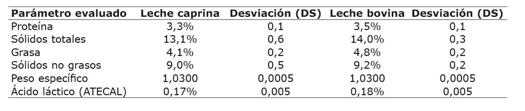 La composición promedio obtenida (Cuadro 2) para las muestras de leche caprina y vacuna no difieren de aquella comúnmente reportada por la literatura (Chacón 2005). Las mismas se enmarcan dentro de los márgenes establecidos por Chacón (2004), quien reportó para la leche de cabra valores promedios de sólidos totales promedio de entre 12,2%, grasa de 3,8% lactosa de 4,5%, proteína de 3,25%, índice de ATECAL de 0,17% y un peso específico de 1,029. Asimismo, reporta para la leche de vaca valores de sólidos totales de 12,0%, grasa de 4,0%, lactosa de 4,9%, proteína de 3,3%, índice de ATECAL de 0,17% y un peso específico de 1,029. Autores como Le Jaquen (1982), Pinto et al. (1984), Tacsan (1987), Haenlein (2002), Oliszewski et al. (2002), USDA et al. (2004) enuncian porcentajes similares.