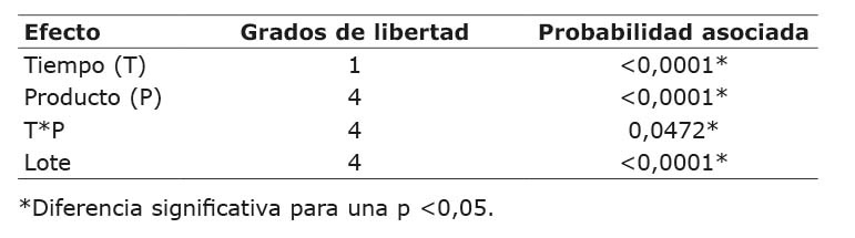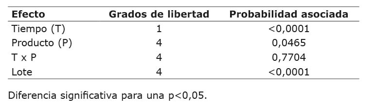 Existieron diferencias significativas entre los lotes (repeticiones) utilizados, los días y los productos, así como una interacción significativa entre los días y los productos (Cuadro 4). La interacción día x producto indica que el efecto del tiempo sobre el pH depende de la formulación. Las diferencias significativas entre los lotes muy posiblemente se presentaron por la artesanalidad del proceso de elaboración adoptado.