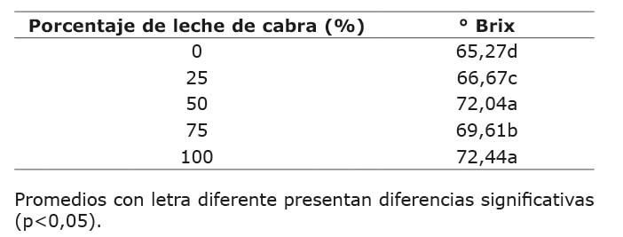 Mientras mayor es el contenido de leche de cabra en el dulce de leche, mayor es el valor de grados Brix que debe alcanzar la muestra para tener una textura adecuada, y para que el producto tenga la apariencia característica del dulce de leche (Cuadro 6). Se observa que todas las formulaciones presentan diferencias significativas, a excepción de las formulaciones 50% y 100% leche de cabra, las cuales presentan los valores más altos de grados Brix. Es importante resaltar que, para lograr obtener la textura deseada en un dulce de leche elaborado con leche de cabra, los valores de grados Brix sobrepasaron lo estipulado en la literatura.