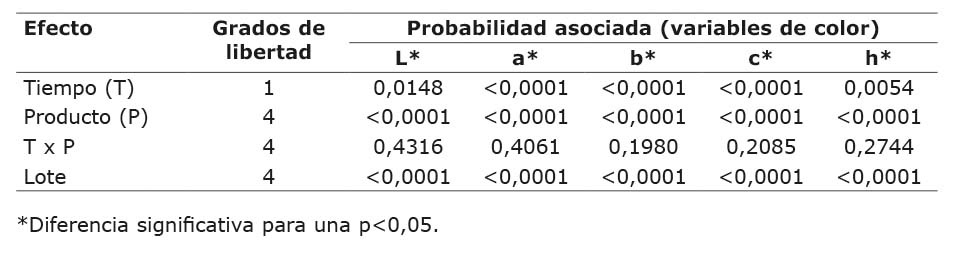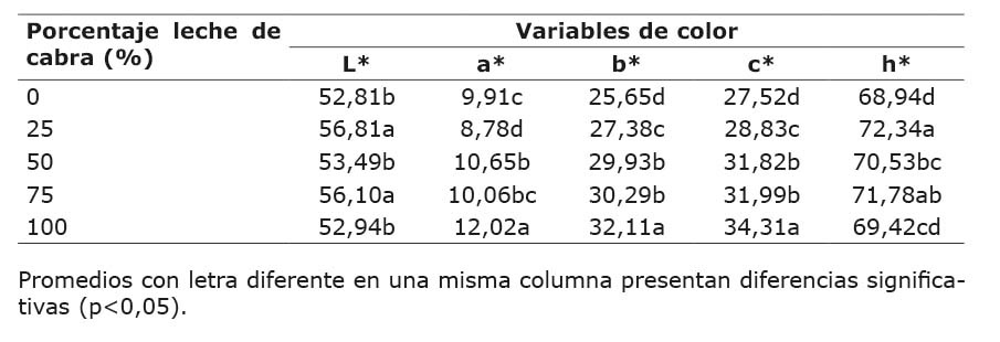 Con el objetivo de analizar el efecto que tiene la leche de cabra sobre las variables de color (L*, a*, b*, c* y h*) determinadas para las diferentes formulaciones experimentales en los dos momentos de medición, se efectuó un análisis de varianza (Cuadro 7).