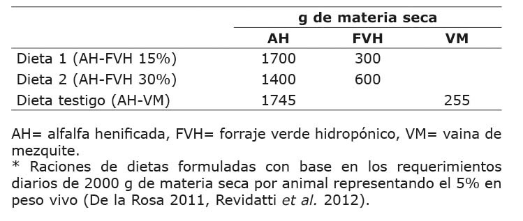Se formularon dos dietas conteniendo forraje verde hidropónico a diferente nivel, y un tratamiento o dieta testigo que incluyó vaina de mezquite (Prosopis glandulosa). Las tres contenían alfalfa henificada y fueron proporcionadas a las cabras ajustando las cantidades ofrecidas de manera individual en base materia seca, tomando como referencia el 5% del peso vivo (De la Rosa 2011, Revidatti et al. 2012) (Cuadro 1).