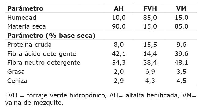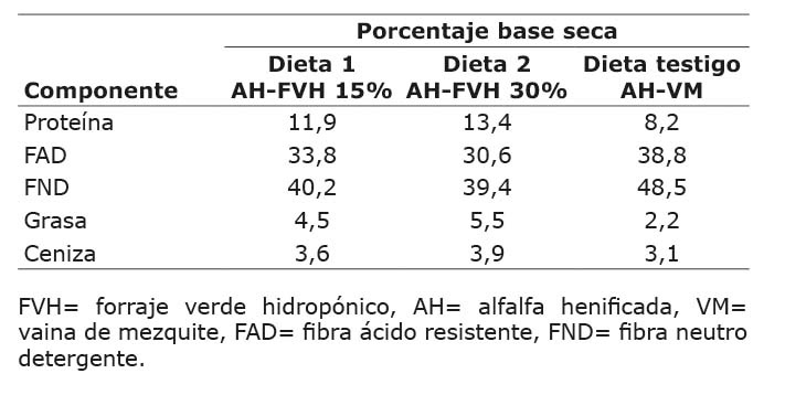 Para la dieta 1 se empleó una relación 85:15 (base seca) de alfalfa henificada y forraje verde hidropónico (AH:FVH). La dieta 2 se formuló con una relación 70:30 de AH y FVH, mientras que la dieta testigo tuvo una relación 87.5:12.5 de alfalfa henificada y vaina de mezquite (AH:VM). Las relaciones 85:15 y 70:30 se formularon de acuerdo a lo recomendado por FAO (2001) que indica un consumo diario de 300 g de materia seca proveniente de forraje verde hidropónico para mejorar la productividad en cabras. Por otro lado, la vaina de mezquite fue incluida en la dieta testigo debido a que la mayoría de las explotaciones caprinas de esta región de México no incluyen concentrados y sales en las dietas para cabras debido a los altos costos, pero tienen posibilidad de obtener vaina de mezquite durante algunas épocas del año. La composición bromatológica de los ingredientes de las dietas (Cuadro 2) se obtuvo mediante los métodos oficiales de la AOAC (2000) para materia seca, proteína cruda, cenizas y grasa. Las fibras ácido y neutro detergente se cuantificaron con el método de fraccionamiento con detergente y filtración subsecuente (Van Soest et al. 1991). Asimismo, se determinó la composición química de las dietas suplementadas (Cuadro 3).