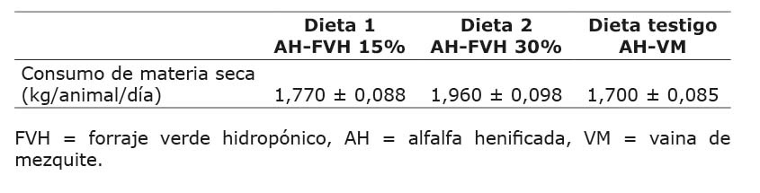 La aceptación del FVH concuerda por lo obtenido por Valdivia (1996), quien realizó pruebas en rumiantes sin problemas de aceptación. Además, el animal al verse en la posibilidad de seleccionar o elegir el alimento ofrecido opta generalmente por aquel verde o fresco, por lo tanto, la cantidad de materia seca consumida es mayor que cuando están consumiendo heno únicamente (Mazorra et al. 2009). Para el caso de la dieta 2 (AH-FVH 30%) los animales tuvieron mayor proporción de material verde, lo cual pudiera explicar el mayor consumo de este tratamiento. Por otro lado, López et al. (2009) señala que existe una relación directa entre los niveles de materia seca del FVH de maíz y el funcionamiento digestivo de los rumiantes, atribuyendo esto al menor contenido de fibras en este tipo de forraje. Lo anterior conlleva a lo mencionado por Rodríguez (2003), que señala que la calidad del FVH radica en su alto contenido de nutrientes tales como proteínas, minerales, vitaminas y componentes enzimáticos en semillas recién germinadas, tallos y hojas jóvenes. Esto pudo haber afectado la aceptación del forraje por los animales y por ende la mayor producción.