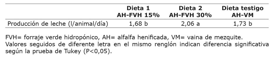 Resumen: El objetivo del presente trabajo fue evaluar la producción y calidad fisicoquímica de leche de cabras al ser suplementadas con dietas que contenían forraje verde hidropónico de maíz. Este estudio se desarrolló en la Comarca Lagunera de Coahuila, México durante los meses de marzo a agosto de 2011. Para la dieta 1 se empleó una relación 85:15 (base seca) de alfalfa henificada y forraje verde hidropónico (AH: FVH). La dieta 2 se formuló con una relación 70:30 de AH y FVH, mientras que la dieta testigo tuvo una relación 87.5:12.5 de alfalfa henificada y vaina de mezquite. Se utilizó un diseño en triple cuadro latino. La producción y calidad de leche fueron mayores al suministrar la dieta compuesta con alfalfa henificada y forraje verde hidropónico de maíz al 30%.