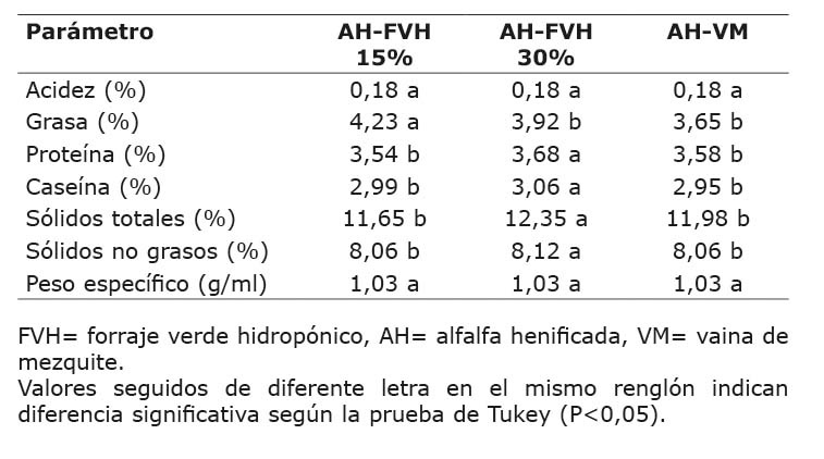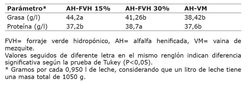 Referente al nivel proteico, las características energéticas y proteicas de la dieta que recibe el animal ejercen una mayor influencia, además de las condiciones genéticas del mismo, siendo tal vez la no degradabilidad de la proteína en el rumen el factor que modifica mayormente el contenido proteico de la leche. El mayor valor en la leche producida con la dieta AH-FVH 30% (Cuadro 7) se debió al mayor contenido proteico de dicha dieta. El total proteico en la leche depende en 60% de la proteína bacteriana producida en el rumen, y 40% de la aportada por los forrajes consumidos (Relling y Mattioli 2002).