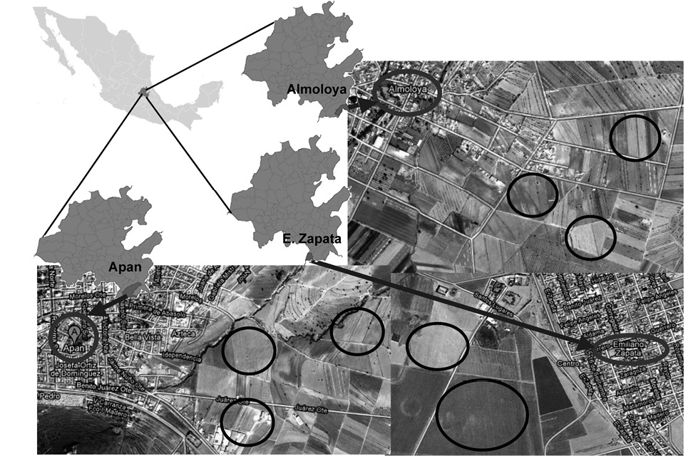 El área de estudio comprende un grupo de parcelas localizadas en los municipios de Apan, Almoloya y Emiliano Zapata, todas ellas con suelos dedicados al cultivo de cebada calidad maltera, como sistema de monocultivo por más de 40 años, ubicados en el sur del Estado de Hidalgo, México.
