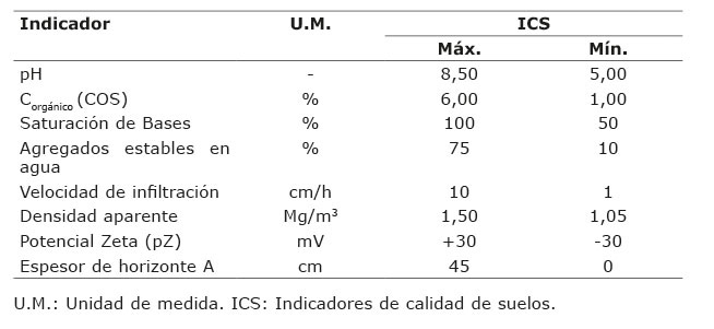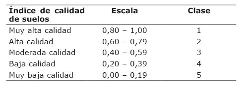 En el caso del indicador espesor del horizonte A, el máximo correspondió al medido en promedio en suelos de referencia (45 cm), mientras que el mínimo se estableció como cero (nivel superficial de la capa arable). Finalmente, se estableció un índice de calidad de suelos (ICS) promediando los valores de todos los indicadores. Para la interpretación del ICS se utilizó una escala de transformación en cinco clases de calidad de suelo de 1 a 5 (Cuadro 2) y según propuesta que reportan Cantú et al. (2009).