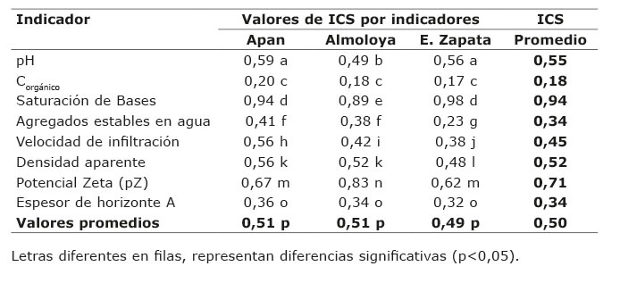 De la evaluación de la calidad de los suelos cebaderos del sur del estado de Hidalgo, teniendo en cuenta el número de indicadores mínimos que se sugieren, y los valores únicos normalizados obtenidos para cada municipio; el indicador que presentó el menor valor en promedio para los tres municipios, fue el COS (0,18) mientras que el mayor correspondió a la saturación de bases (0,94). El pH y la densidad aparente presentaron valores promedios intermedios (0,49 – 0,59), cercanos al 50% y los restantes indicadores oscilaron entre valores desde 0,34 hasta 0,45. El nuevo indicador que se propone, el pZ, marcó un ICS promedio de la región sur de 0,71 (Cuadro 3).