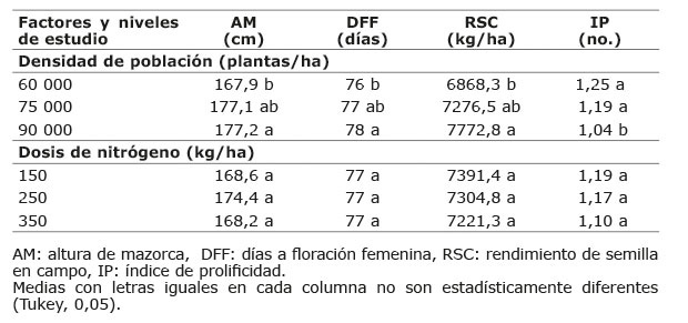 Línea CML 142. En los resultados de análisis de varianza muestran que la densidad de población presentó efecto significativo en altura de mazorca (P≤0,05), días a floración femenina (P≤0,01), rendimiento de semilla en campo (P≤0,05) y el índice de prolificidad (P≤0,01). La fertilización nitrogenada únicamente afectó estadísticamente el índice de prolificidad (P). No hubo interacción significativa de estos factores en este grupo de caracteres evaluados.