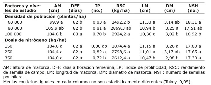 Los resultados de la prueba de comparación de medias, indican que la mayor longitud de mazorca se asoció con la densidad de 60 000 plantas/ha y este disminuyó al incrementar la densidad a 80 000 y 100 000 plantas/ha, mientras que el mayor diámetro de mazorca se asoció con 80 000 plantas/ha aunque no hubo diferencias significativas con 60 000 plantas/ha (Cuadro 2), comportamiento esperado ya que las altas densidades provocan competencia entre plantas, y por lo tanto se presenta una respuesta negativa en el diámetro y longitud de mazorca (Oyervides et al. 1990, Lemcoff y Loomis 1994, Feizbakhsh et al. (2007). El número de semillas por hilera (NSH) disminuyó significativamente con el incremento en la densidad de población, este hecho se atribuye que a altas densidades se forman mazorcas pequeñas y con ello menor número de semillas por hilera (Roy y Biswas 1992, Feizbakhsh et al. 2007). El incremento de la fertilización nitrogenada tuvo efectos negativos en el diámetro y longitud de mazorca. En este tópico, Lemcoff y Loomis (1986), Barbieri et al. (2000) y Stamp et al. (2000) indican que la aplicación de nitrógeno modifica positivamente algunas características de componente de rendimiento. Por otro lado, Lemcoff y Loomis (1994) señalan que el rendimiento tiene mayor relación con la densidad de población que con la fertilización nitrogenada.