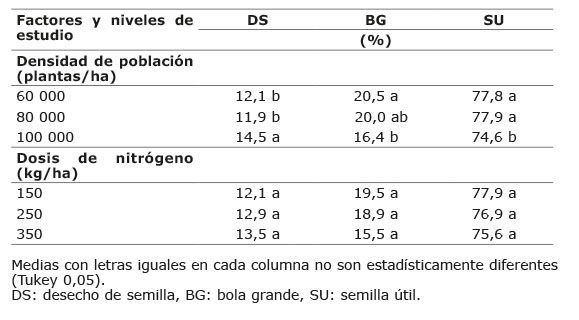 Por otro lado, en los caracteres de clasificación de semilla la densidad de población sólo presentó diferencias significativas (P≤0,05) en las clases desecho de semilla, semilla bola grande y en el porcentaje de semilla útil (P≤0,01). Por su parte, los cambios en los niveles de nitrógeno no mostraron efectos estadísticos significativos para este grupo de variables).