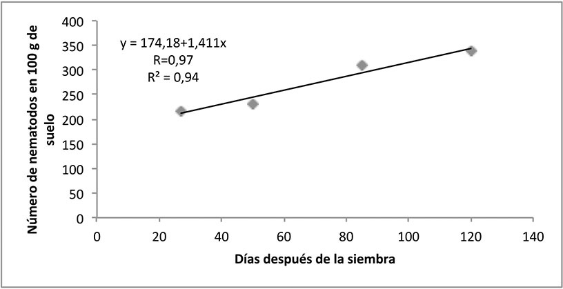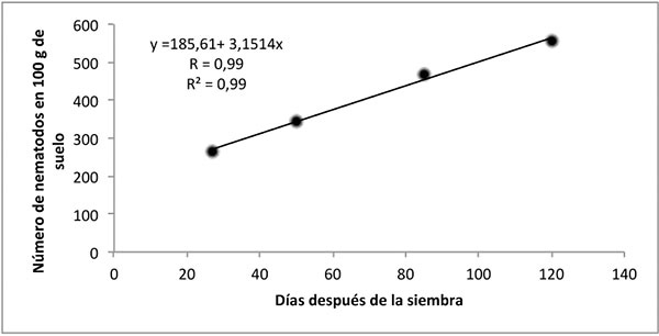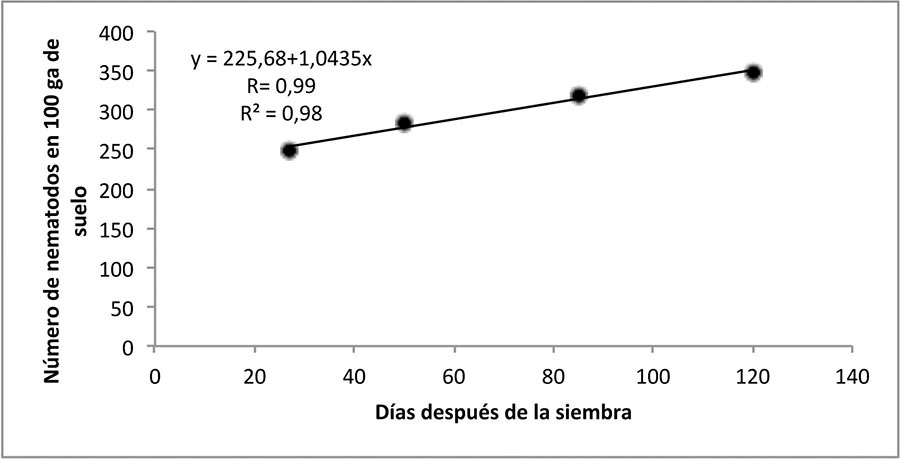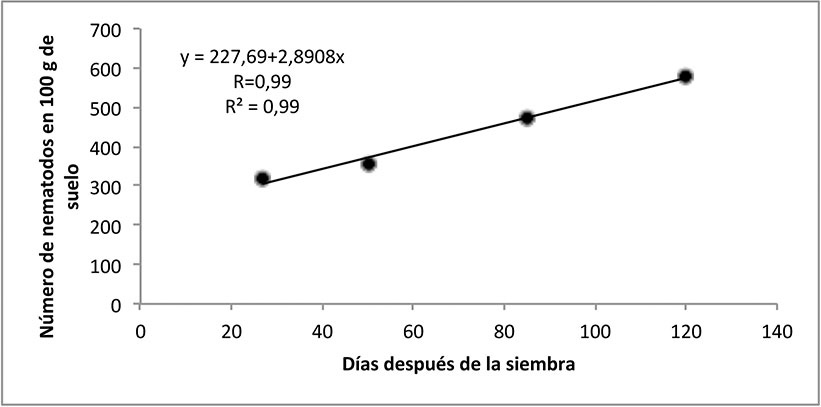 Este tipo de crecimiento poblacional puede explicarse con una función de regresión lineal, por lo que el modelo matemático que mejor se ajusta al crecimiento poblacional de estos nematodos fue el lineal. Este modelo de crecimiento ya ha sido observado para poblaciones de nematodos como Pratylenchus en el cultivo del arroz en Costa Rica (Guzmán-Hernández et al. 2011). De igual forma, este tipo de crecimiento poblacional ha sido reportado por González et al. (2007), los que encontraron que poblaciones del género Radopholus asociadas al cultivo del plátano se incrementaron consistentemente desde el inicio hasta la senescencia de la planta, llegando a obtener poblaciones de 40 000 individuos lo que se considera extremadamente alto. Este comportamiento también coincide con lo encontrado en el presente estudio y se debe a la alta dependencia que los nematodos endoparásitos muestran en relación a sus hospederos (Cadet et al. 2005), lo que hace que incrementen sus poblaciones proporcionalmente a la disponibilidad de alimentos que sus hospederos ofrecen. Este crecimiento lineal se ve influenciado también por el hecho de que plantas con sistemas radiculares extensos, como es propio de plantas adultas, proveen más alimentos y refugio a los nematodos que plantas jóvenes.
