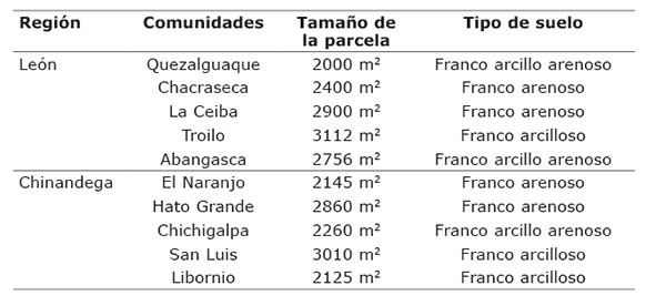 El estudio se realizó durante el periodo 2010-2011 en la región occidental de Nicaragua, departamentos de León y Chinandega. El clima de la zona es tropical, con temperaturas que varían entre 26,1 y 36,3oC, precipitación de 1388 a 1702 mm anuales y una altura entre 130-200 msnm (MAGFOR 2000).