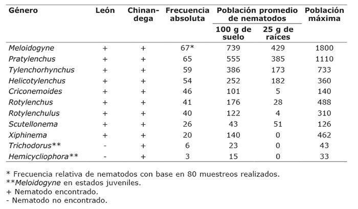 Se encontraron en total once géneros de nematodos fitoparásitos asociados al tomate. Los géneros Trichodorus y Hemicycliophora solamente fueron encontrados en comunidades del Departamento de Chinandega (Cuadro 2).
