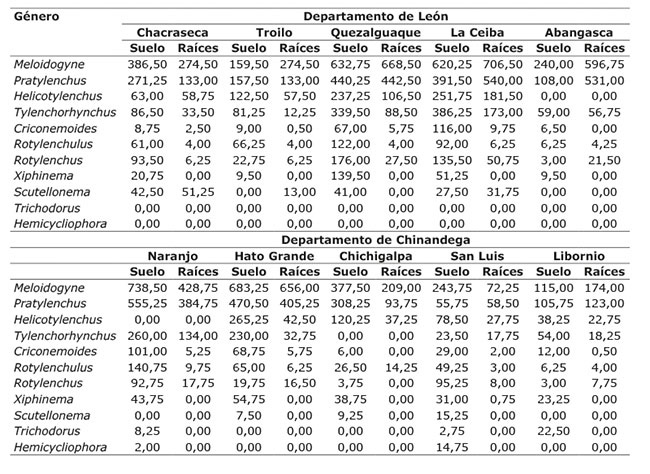 Los promedios poblacionales más bajos de nematodos (P≤ 0,05) se encontraron en San Luis y Libornio, ubicadas en el departamento de Chinandega (Cuadro 3). Estas localidades se caracterizan por poseer suelos con altos contenidos de arcilla (franco-arcilloso) y poca porosidad en su estructura, lo que afecta el incremento de las poblaciones de nematodos, debido a que dificultan su acceso a fuentes de alimentación y su reproducción (Griffiths y Caul 1993).