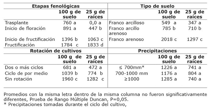 Tipo de rotación y su efecto sobre poblaciones de nematodos: en relación con los tipos de rotación, las mayores poblaciones de nematodos (P≤0,05) fueron encontradas en plantaciones utilizadas continuamente para la producción de tomate. En estas, se obtuvieron promedios poblacionales de 1960 y 1282 individuos en suelo y raíces (Cuadro 4). La ausencia de rotación de cultivos favoreció el incremento del número de nematodos en el suelo al mantenerse el mismo hospedante por largos periodos de tiempo (Chen y Tsay 2006).