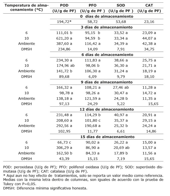 La actividad de catalasa (CAT) no presentó diferencias significativas (α=0,05) entre tratamientos durante el periodo de almacenamiento (Cuadro 1), lo que puede sugerir que esta enzima es estable a las temperaturas empleadas (6, 10ºC y ambiente), y coincide con Balois et al. (2008) quienes reportan para frutos de pitaya, que la actividad de CAT es insensible al frío y a condiciones de manejo a temperatura ambiente. En este mismo sentido, Sala y Lafuente (2000) indican que en frutos como la mandarina, la CAT es una enzima antioxidante involucrada en los mecanismos de protección contra el estrés por frío. En contraste a lo observado, en hojas maduras de nuez vómica (Strychnos nux-vomica L.), Vijayakumar et al. (2009), quienes determinaron una alta actividad de la CAT. Lo anterior indica que estas diferencias pueden ser dependientes de la especie, momento fisiológico de cosecha, tiempo de almacenamiento, entre otros factores.