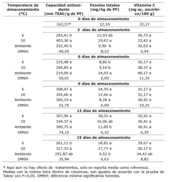 De acuerdo con la comparación de medias (Cuadro 2), el contenido de vitamina C (ácido ascórbico) no presentó diferencias significativas (α=0,05) durante la mayor parte del periodo de almacenamiento, a excepción del último muestreo, donde el tratamiento a 6ºC fue significativamente superior al testigo. En relación con esta fecha de evaluación se ha mencionado que el almacenamiento a bajas temperaturas se considera eficiente en la reducción de las pérdidas de ácido ascórbico, incluso la congelación suele ser aún mejor (Rapisarda et al. 2008, Tavarini et al. 2008), y al ser este un compuesto no enzimático que contribuye a la capacidad antioxidante, su conservación es importante durante el manejo poscosecha de frutas y hortalizas (Velioglu et al. 1998, Shivashankara et al. 2004).