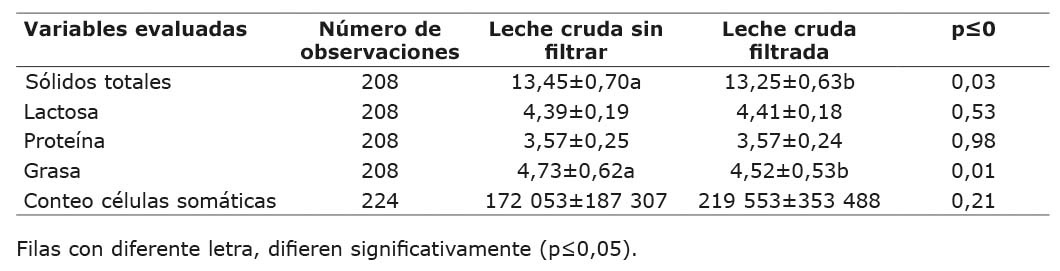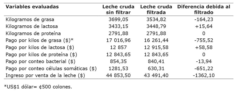 Impacto económico del filtrado en el sistema de producción. Según los cálculos por pago de la LC equivalente a los kg de grasa, kg de proteína y kg de lactosa, contenidos en el volumen de LC total, entregado en el año 2009 y al incremento en precio por la bonificación debida al conteo bacterial y el de células somáticas, el valor de cada litro de LC fluctuó entre ¢286,77 (US$0,57) y ¢278,06 (US$0,56) para la LC sin filtrar y LC filtrada, respectivamente. Tal diferencia, provocó que el sistema de producción dejara de percibir el 3,04% del ingreso total (Cuadro 2), debido a la disminución del contenido de grasa (p<0,05) y a la tendencia obtenida de incrementar las células somáticas en la LC, al aplicar el proceso de filtrado (Cuadro 1). Esta reducción en el ingreso total por venta de leche, podría ser equivalente a 68 quintales de alimento balanceado, 30 bolsas de 23 kg de premezcla mineral y de 76 bolsas de 20 kg de grasa sobrepasante, insumos que podrían mejorar el perfil de nutrimentos en dietas de animales con un nivel de producción láctea superior al promedio o para corregir problemas reproductivos o de condición corporal de animales presentes en la finca.