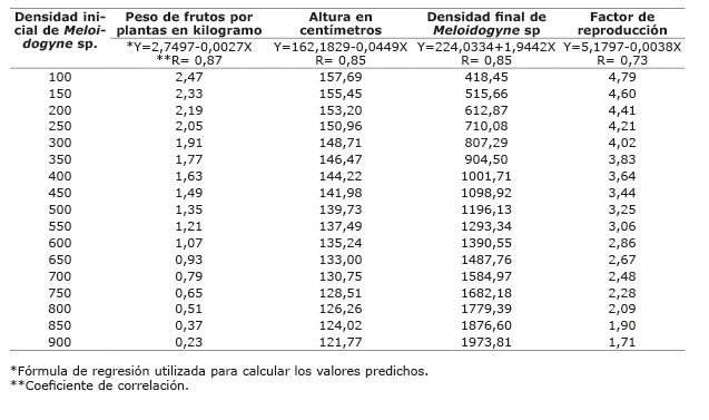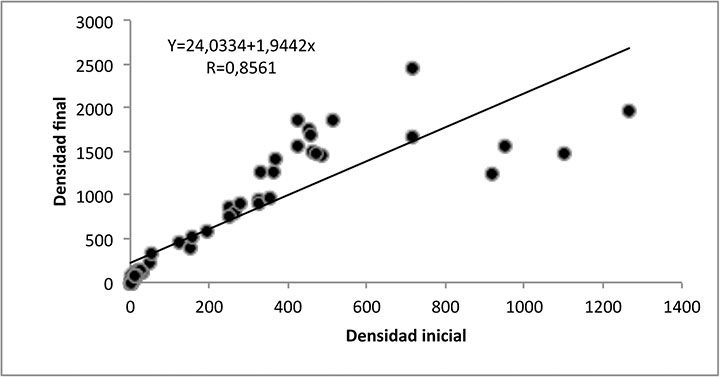La regresión lineal realizada a la densidad inicial y final de Meloidogyne sp. en el cultivo del tomate, indicó que ambas variables están positivamente correlacionadas y tienen una relación lineal significativa (Figura 1), este tipo de relación ha sido previamente reportada para Meloidogyne sp. en tomate, por Ferris (1985).