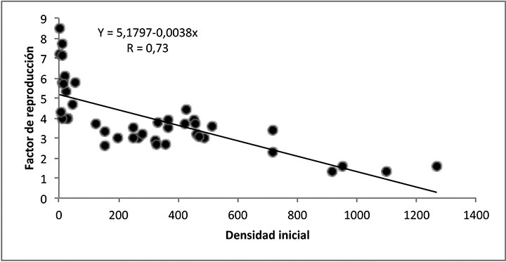 Esta correlación mostró que el FR es de 3,64 cuando la Pi es igual a 400 nematodos/100 g de suelo (Cuadro 1). Sin embargo, cuando la Pi es igual a 700 nematodos/100 g de suelo disminuye el FR a 2,48. El-Sherif et al. (2007) afirman que bajas densidades de Meloidogyne sp. al inicio del cultivo generan incrementos poblacionales muy altos. Lo anterior debido a que son expuestos a una menor competencia intraespecífica en la rizosfera de la planta (McSorley et al. 1992). Este tipo de incremento poblacional está asociado a la susceptibilidad del hospedero y condiciones ambientales favorables al nematodo lo que provoca un incremento en su población (Ehwaeti et al. 1998). Esto es congruente con lo reportado por Khan et al. (1986), quien muestra que una Pi alta causa una desaceleración en el incremento poblacional de Meloidogyne sp. Estos argumentan que esta disminución en la tasa de crecimiento poblacional se debe principalmente a la competencia intraespecífica de este organismo, la disponibilidad de espacio y el acceso a alimentos. Estos factores pueden afectar el patosistema patógeno-hospedero, creando condiciones adversas para el desarrollo de las poblaciones de Meloidogyne sp.