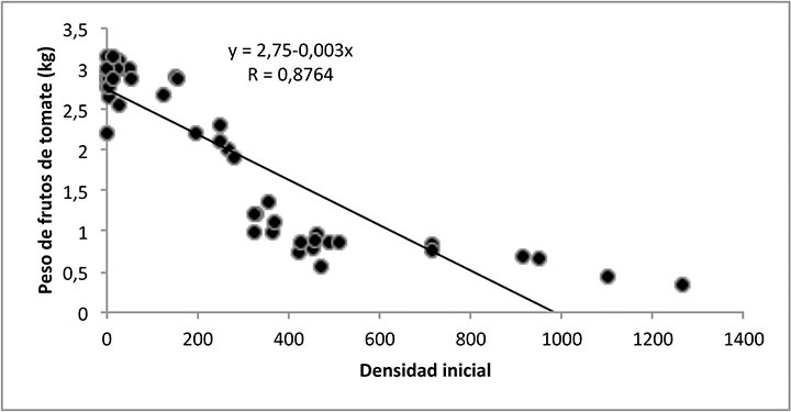 El análisis económico indicó que en promedio cada planta debió producir al menos 1,02 kg de tomate. A los datos de tomate producido se les realizó una regresión lineal para determinar el nivel de influencia de la Pi sobre ellos. La fórmula de la regresión lineal obtenida fue Y=2,755-0,003x (Figura 3), indicando que por cada nematodo encontrado al inicio del cultivo hubo una reducción en la producción de 0,003 kg por planta.