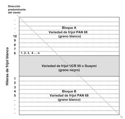 La parcela experimental consistió en tres bloques de diez lomillos de 15 m de largo espaciados 0,8 m. En el bloque central se ubicó el frijol negro (UCR 55 o Guaymí) y en los laterales el frijol blanco (PAN 68) (Figura 1). Para la siembra de las parcelas del ensayo se utilizó una sembradora manual que coloca 10-12 semillas por metro, para una densidad aproximada de 200 000 plantas/ha. El manejo del cultivo se llevó a cabo de acuerdo a las normas de producción comercial. A la siembra se aplicó fertilizante 10-30-10 (150kg/ha) e insecticida granulado clorpirifós. Las arvenses se controlaron con aplicaciones de paraquat y glifosato, las plagas insectiles con deltametrina e imidacloprid, las enfermedades fungosas con benomil y azoxistrobina, y la fertilización al suelo se reforzó foliarmente con un multimineral (9,1% N; 6,6% P; 5,0% K; 1250 ppm S, 332 ppm B; 17 ppm Co, 664 ppm Zn; 332 ppm Cu; 42 ppm Mo; 207 ppm Ca; 332 ppm Mn; 415 ppm Fe; 207 ppm Mg). Las parcelas del ensayo siempre se ubicaron en un lugar completamente aislado para evitar contaminación con polen proveniente de otras siembras de frijol cercanas, y se realizaron en terrenos provenientes de una rotación con maíz o en descanso, para evitar la aparición de plantas voluntarias de frijol.