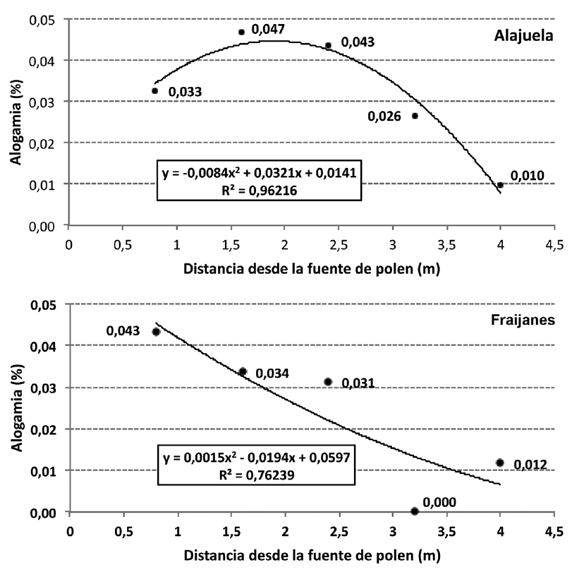 El factor que fue determinante en la tasa de alogamia en frijol común es la distancia respecto a la fuente de polen. La tasa de polinización cruzada natural decreció según aumentó la distancia respecto a la fuente de polen y se obtuvo una correlación inversa de tipo polinomial en las dos localidades donde se sembraron los ensayos (Figura 2). Solo en Alajuela la correlación fue significativa (p<0,05; r2=0,9622), mientras que en Fraijanes, solo se mantuvo la tendencia con una fuerte asociación entre las variables (r2=0,7624), talvez por falta de un mayor número de ensayos que le dieran más consistencia a los datos. El resultado obtenido en Alajuela, concuerda con Miranda (1971), Royer et al. (2000) y Ferreira et al. (2007), quienes indican que el cruzamiento natural en frijol decrece conforme aumenta la distancia de la fuente de polen.