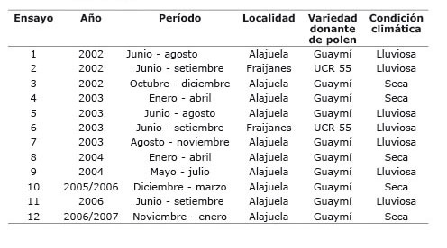 Durante la realización de los ensayos se llevó registro de las fechas de inicio y final de las principales etapas fenológicas del cultivo. Durante la floración se evitó la aplicación de insecticidas y se observó cualitativamente la actividad (visita a flores) y tipo de polinizadores que visitaron la parcela. También se obtuvo información de la dirección del viento predominante y las condiciones climáticas imperantes durante la realización del ensayo (temperatura promedio, humedad relativa y precipitación) a través del Instituto Meteorológico Nacional de Costa Rica.