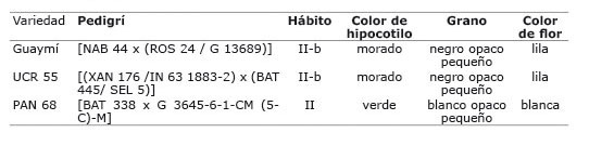 Se utilizó el color del hipocotilo como marcador morfológico para identificar las progenies originadas del cruzamiento entre dos variedades de frijol contrastantes para este caracter. El cruzamiento se evaluó en forma unidireccional de una variedad de grano negro con el caracter dominante para el color de hipocotilo (morado) a una variedad de grano blanco con el carácter recesivo para el color de hipocotilo (verde). En Alajuela se utilizó como donante de polen la variedad comercial Guaymí y en Fraijanes la variedad UCR 55 (Cuadro 2), debido a su adaptación diferencial a suelos de origen volcánico con baja disponibilidad de fósforo como los de la FEF (Araya y Acosta, 2000). En ambas localidades se utilizó la variedad PAN 68 como variedad receptora de polen y se evaluó el porcentaje de alogamia en las semillas que ella produjo.