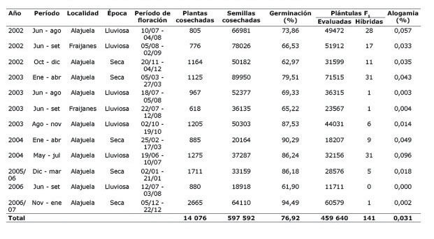 En Alajuela el cruzamiento natural varió desde 0,000 hasta 0,096%, mientras que en Fraijanes varió de 0,004 hasta 0,033% (Cuadro 3). En los doce ensayos realizados en ambas localidades se cosecharon 597 592 semillas de testa blanca, de las que germinó un 76,92%. Se obtuvieron 459 640 plántulas de las que 141 tuvieron hipocotilo morado e indicaron que efectivamente se produjo eventos de polinización cruzada en campo. Con base en el número de individuos híbridos en la F1 de la variedad PAN 68, se calculó el porcentaje de alogamia en las plántulas germinadas (Cuadro 3). Aunque el porcentaje de germinación de la semilla utilizada para evaluar el cruzamiento natural se podría considerar bajo, este se acerca al mínimo requerido (80%) para una semilla de categoría Certificada (ONS, 2012). En todo caso, la tasa de alogamia determinada en este trabajo fue muy baja (0,031%) por lo que el efecto del bajo porcentaje de germinación en su estimación sería mínimo.