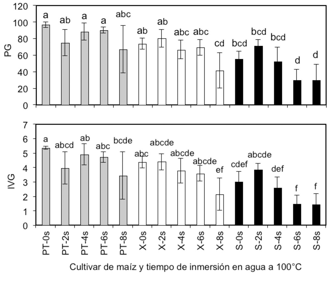 Por su parte, Méndez et al. (2008) señalan el efecto favorable de la temperatura sobre la permeabilidad del pericarpio. No obstante, incrementos en el tiempo de inmersión en agua caliente redujeron considerablemente el PG, observándose en este estudio que cuando las semillas se sumergen por 6 y 8 s la germinación decrece, indicando un mayor deterioro en los granos maíz. Este mismo comportamiento ha sido reportado por Méndez et al. (2007), al señalar que a medida que se incrementan los tiempos de inmersión en agua caliente a 100 °C se provoca un deterioro en la semilla de maíz, originando una baja germinación. De acuerdo a los resultados obtenidos, la semilla de País Tuxpeño presentó el mayor grado de tolerancia al deterioro, ya que, aun con tiempos de inmersión de 8 s, mostró mayor porcentaje de germinación que en las semillas de X´nuuknal y Sinaloa, quienes fueron más susceptibles al tratamiento calórico de 6 y 8 s de inmersión.