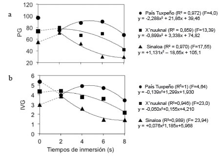 En el índice de velocidad de germinación (IVG), se observó que las semillas germinadas por día disminuyeron con el aumento del tiempo de inmersión para X`nuuknal y Sinaloa (Figura 1b). Cuando las semillas no fueron inmersas en agua caliente (0 s), se observó en País Tuxpeño mayor IVG seguido del X´nuuknal y Sinaloa. El cultivar País Tuxpeño disminuyó su IVG a los 2 s y posteriormente, se incrementó a medida que aumentó el tiempo de inmersión hasta los 4 s, para luego disminuir conforme aumentó el tiempo de inmersión. Por el contrario, en las semillas X´nuuknal y Sinaloa la inmersión por 2 s favoreció la velocidad de germinación; sin embargo, tiempos mayores de inmersión provocaron una disminución en el IVG. Tales efectos pueden estar asociados a alteraciones en la funcionalidad de membranas, lisis membranal o daños estructurales en el ADN que ocurren durante las primeras horas de imbibición de los tejidos seminales (Cruz et al., 1995). La sensibilidad de las semillas por efecto de los tiempos de inmersión y las variables de germinación PG e IVG mostró una función polinómica (Figura 2) la cual describe la necesidad de aplicar o no el tratamiento de agua a 100 °C para mejorar la germinación.