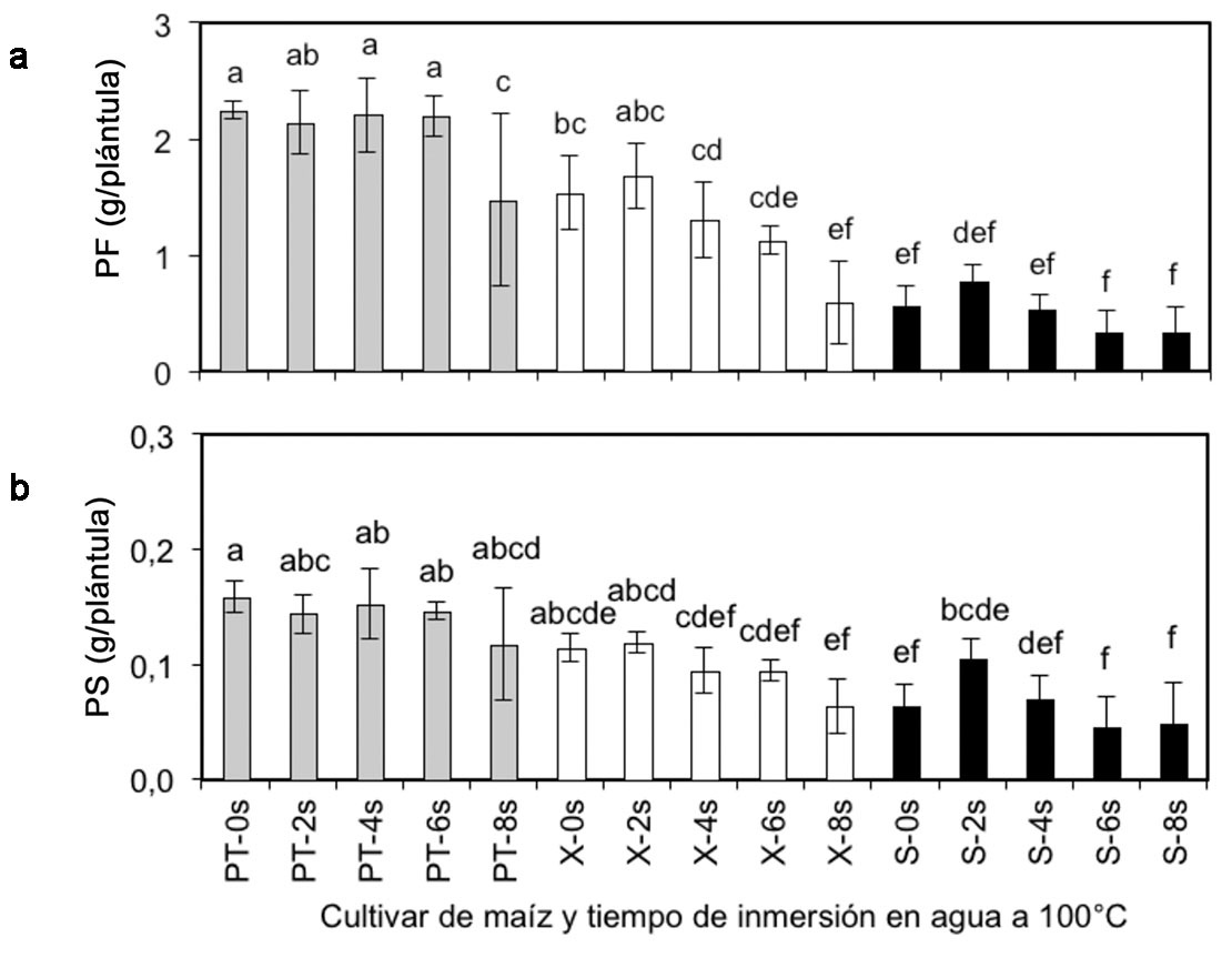 Cuando las semillas no fueron tratadas con agua caliente, las semillas de País Tuxpeño mostraron los valores más altos de PF y PS (2,24 y 0,158 g/plántula, respectivamente) (Figura 3). La producción de PF y PS de esta variedad, solamente fue afectada cuando las semillas fueron inmersas por un tiempo de 8 s, disminuyendo la producción de las plántulas a un 35 y 26%, respectivamente.