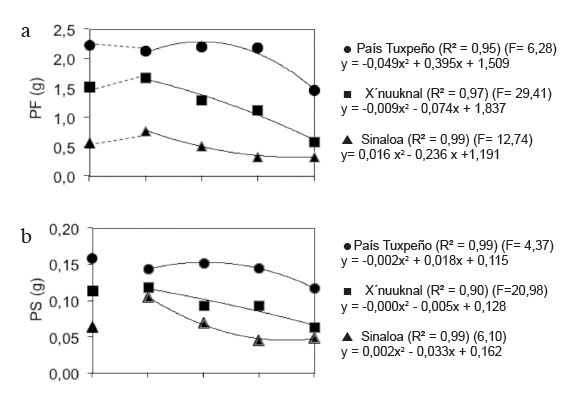 Contrario a lo observado con las semillas de País Tuxpeño, las semillas de X`nuuknal y Sinaloa produjeron menor biomasa aun sin haber sido sumergidas en agua caliente; no obstante, al ser inmersas por 2 s se observó un incremento en la producción de biomasa, la cual decreció posteriormente conforme se incrementó el tiempo de inmersión. Se observó que al tiempo de inmersión de 8 s la disminución de PF y PS de las plántulas fue del 65 y 47% para las semillas de X`nuuknal y del 57 y 53% para las de Sinaloa, respectivamente. Estos resultados muestran que las semillas de la variedad País Tuxpeño no son susceptibles a una temperatura del agua de 100 °C; por el contrario, las de X`nuuknal y Sinaloa son más susceptibles, pero con tiempos breves de inmersión (2 s) puede mejorarse la producción de biomasa. Esto coincide con Méndez (2007), quien menciona que a medida que se someten semillas de maíz a mayores tiempos de inmersión se provoca un deterioro en la semilla que origina bajo porcentaje de germinación y crecimiento de plántulas con menor peso fresco y seco. La sensibilidad de las semillas por efecto de los tiempos de inmersión y la producción de biomasa puede observarse en la relación polinómica de la Figura 4, en donde se muestra la conveniencia de aplicar el tratamiento de inmersión de las semillas en agua a 100 °C y los tiempos más convenientes de inmersión.
